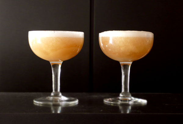 5 cl eiskaltes Püree von geschälten weissen Pfirsichen, 10 cl gut gekühlter Prosecco. Pfirsichpüree und Prosecco vorsichtig in ein gekühltes Champagnerkelch geben und umrühren. Auch der Champagnerkelch gehört zur Retroästhetik, bitte keine Flûtes.