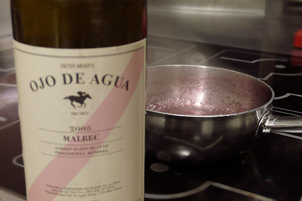 Ich habe mich mit einer Flasche Demiglace der Marke Anonyme Köche (Lizenznehmer bitte melden) gewappnet, mit der Absicht, sein Entrecôte mit einem Rotweinjus aus seinem sublimen Malbec zu begleiten.