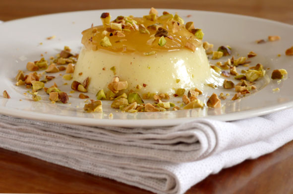 Am besten über Nacht kühl stellen. Vor dem Stürzen auf Dessertteller Förmchen ins heisse Wasserbad stellen, damit sich Gelee und Panna Cotta gut lösen (tricky!). Mit viel grob gehackten Pistazien anrichten.