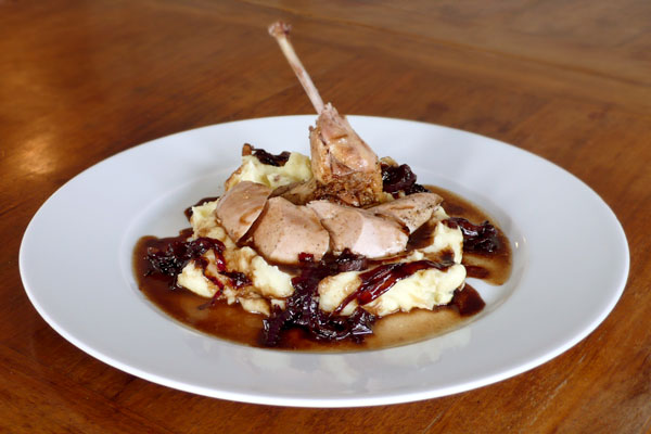 Den Fasan gab es, mit Weisswein und Wurzelgemüse im Ofen geschmort, auf einem luftigen Kartoffelpüree. Dazu ein wunderbares Schalottenconfit.