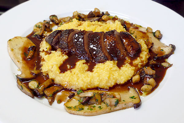 Die Entenbrust aufschneiden und auf eine kernige Bramata-Polenta betten. Dazu gemischte Pilze mit Schalotte und Petersilie. Die grossen da sind Kräuterseitlinge.