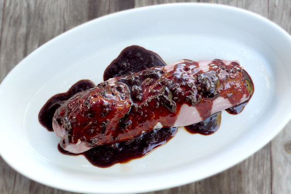 2 Tassen Rotwein bei hoher Hitze auf die Hälfte reduzieren, 1 Tasse Portwein und pro Person drei gedörrte Zwetschgen dazugeben. Sanft einköcheln bis alles andickt. 1 Esslöffel Demiglace einrühren. Salzen, pfeffern und warm halten. Sauce kurz vor dem Servieren mit eiskalter Butter montieren.