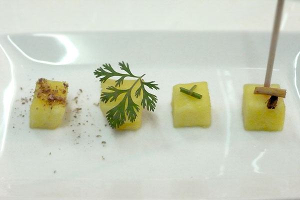 Es wird in der heutigen Hochgastronomie viel von Texturen gesprochen. Simpel heruntergebrochen auf ein Küchenkraut serviert er ein Stückchen Ananas mit vier verschiedenen Formen von Koriander, von links: Samen, Blatt, Stängel, Wurzel.
