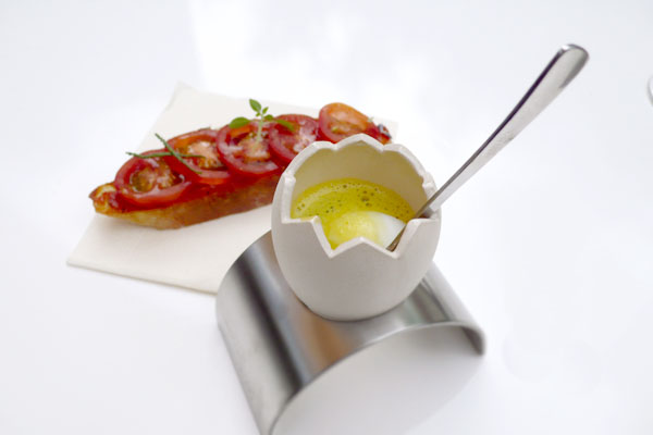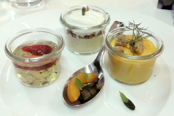 Als Amuse-Gueule gab es ein lauwarmes, wachsweiches Wachtelei mit Safranschaum. Darunter, zur Überraschung, eine feine Kräutercrème. Auch die Tomaten-Bruschetta hatte ein Darunter: Ein hochparfümiertes Tomatenpesto mit Olivenkraut, Thymian, Rosmarin … Ich musste kurz für mich schmunzeln. Neben meinem geistigen Ohr hörte ich eine resolute Toskanerin schnauben: Santo cielo! Hat der Koch Rasierwasser an seinen Händen?