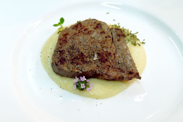 Als Fleischgang bringt er eine Paillarde vom Wagyurind mit dreierlei Thymian auf einer cremigen Polenta. Dazu trinken wir einen wunderbaren 2004 Granato der famosen Elisabetta Foradori.