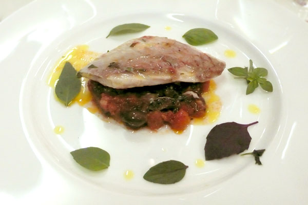 Weiter geht es mit einer gebeizten Rotbarbe auf einem Tomatenconfit (diesmal extrem schön ausgewogen, bestehend aus Tomaten-Concassée, getrockneten Tomaten, konfierten Zitronen und Oliven). Das Kraut dazu? Basilikum, was sonst zu Tomaten. Jedoch gleich in sieben verschiedenen Sorten.