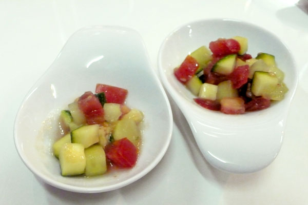 Dazu noch ein letzter Vergleich: Tomaten, Gurken und Avocadowürfel einmal 4 Stunden mit einem Gewürzöl mariniert und einmal kurz vor dem Servieren damit beträufelt. Ein Unterschied wie Tag und Nacht.