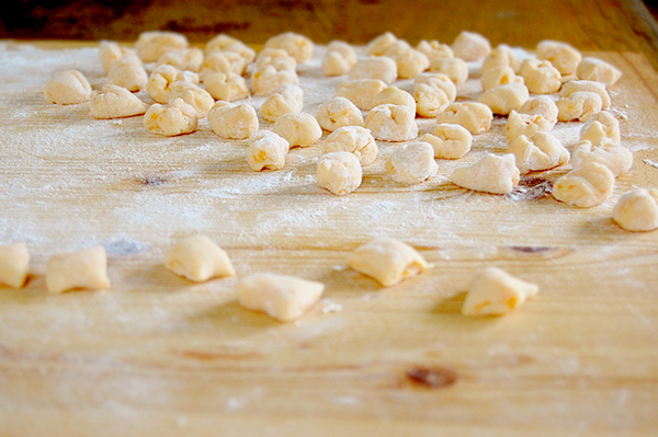 Ei, Gewürze und Mehl dazugeben und alles zu einem weichen Teig verkneten. Nach und nach kleine Teigstücke zu Rollen und dann zu Gnocchi formen.