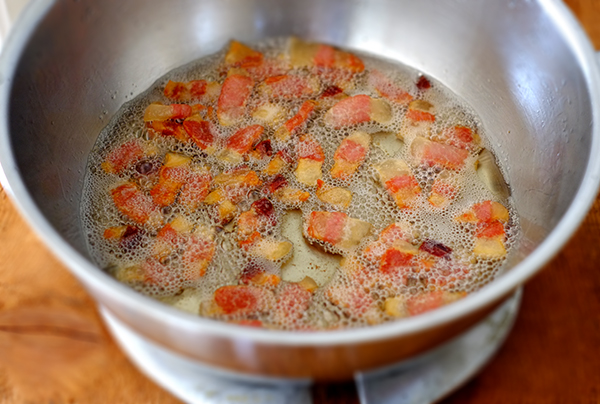 Erster wichtiger Kniff: Dem Guanciale Zeit lassen! Das Fett soll langsam schmelzen. Nichts soll anbrennen. Das dauert gut und gerne 20 Minuten.