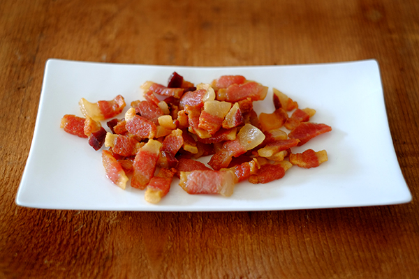 Guanciale-Streifen beiseite stellen. Übriges Fett aus der Pfanne abgiessen und aufbewahren (zum Beispiel für beispiellos gute Bratkartoffeln!).