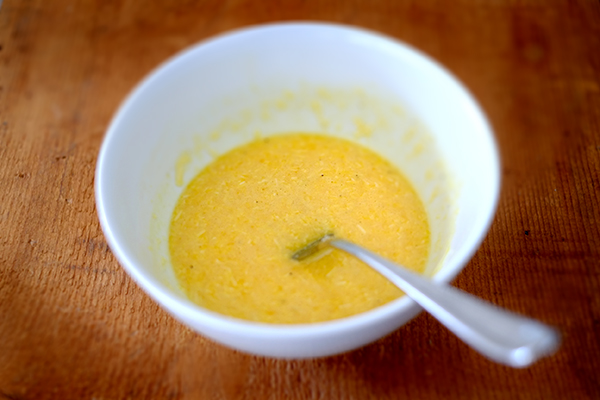 Inzwischen in einer kleinen Schüssel 4 frische, mittelgrosse Bio-Eier verquirlen, 4 EL frisch geriebenen Pecorino romano daruntermischen und mit frisch gemahlenem schwarzen Pfeffer würzen.
