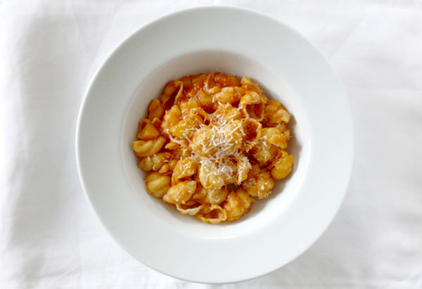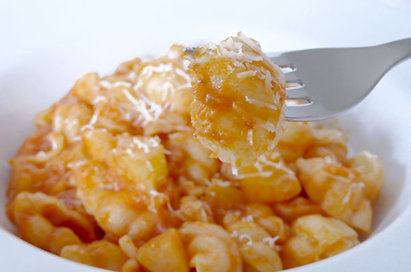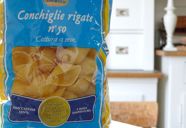 Die Muschelform ist übrigens in beiden Fällen deshalb so wichtig, weil sich die Kartoffelstücke so gut darin verfangen können. Das ginge ja mit Penne, als Beispiel, nicht. Sauce und Pasta würden also keine Einheit bilden: Sehr verdriesslich!
