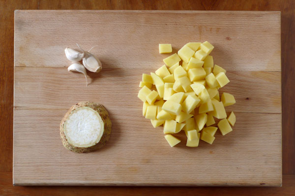 In einer Sauteuse (Schwenkpfanne) Olivenöl bei mittlerer Hitze behutsam mit 3 angedrückten Knoblauchzehen und einer Scheibe Knollensellerie aromatisieren. Vier gute, mittelgrosse Kartoffeln in kleine Würfel (1,5 cm Kantenlänge) schneiden und kurz im Öl anziehen.