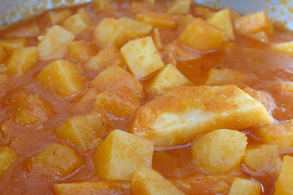 Die Zubereitungsschritte sind zu Beginn gleich. Jedoch giesst man doppelt so viel Wasser an und simmert die Kartoffeln nur 45 Minuten. Dadurch haben sie noch leicht Biss, die Sauce bleibt klar und flüssig.