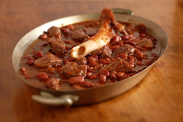 Passierte Tomaten dazu und mit Brühe aufgiessen. Die über Nacht eingeweichten Bohnen dazugeben und auf kleiner Hitze zwei Stunden weich schmoren.
