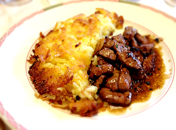 Aus der Auswahl von etwa zehn Hauptspeisen, habe ich suuri Kalbsläberli mit Rösti gewählt. Einer Rösti, wohl gemerkt, die dir das Wasser in den Mund und die Tränen in die Augen treibt, so knusprig und buttrig war die.