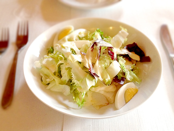 Mein Renner als Vorspeise im Winter bleibt weiterhin: Puntarelle-Salat von der Catalogna. Vinaigrette aus Sardellen, Honig, Peperoncino Zitrone, Olivenöl. Die bitter-süssen Noten passen gut zu geräucherter Forelle und geräucherten Crevetten.