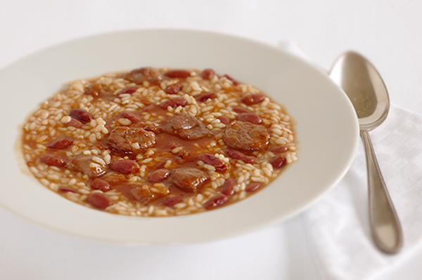 Wenn er gar ist, kippt man von diesem grossartigen Bohnen-Lamm-Eintopf dazu und labt sich an einem herzhaften Risotto rusticano!