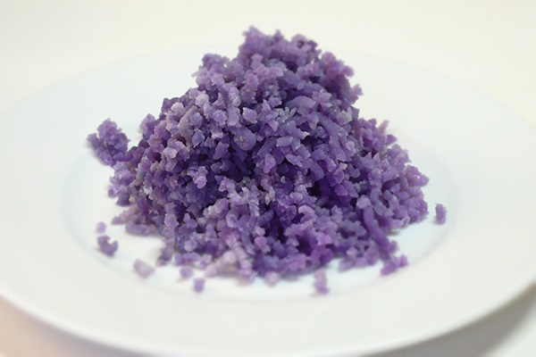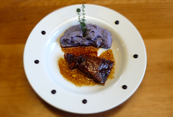 Als Beilage gab es blaue St. Galler-Kartoffeln, die als Püree leider etwas von ihrem intensiven Violett einbüssen.