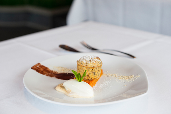 Kürbistörtchen mit flüssigem Bierkern, Baileys, Bolivia Chocolate. Dazu 2008 Chardonnay Beerenauslese, Tschida, Neusiedlersee.