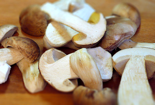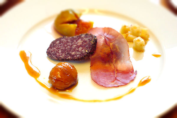 Auf dem Herbstteller gab es als Einstieg wunderbar pfeffrige Hirschsalami von Tichy und Wildschweinschinken. Darunter versteckt sich ein halber Steinpilz. Mal eben kurz mit Schalotten in Butter geschwenkt.