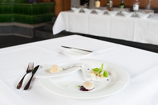 Schöner Scherbenhaufen: Drei Variationen von der Jakobsmuschel auf zersägten Tellern zu einem perfekten Gang inszeniert.
