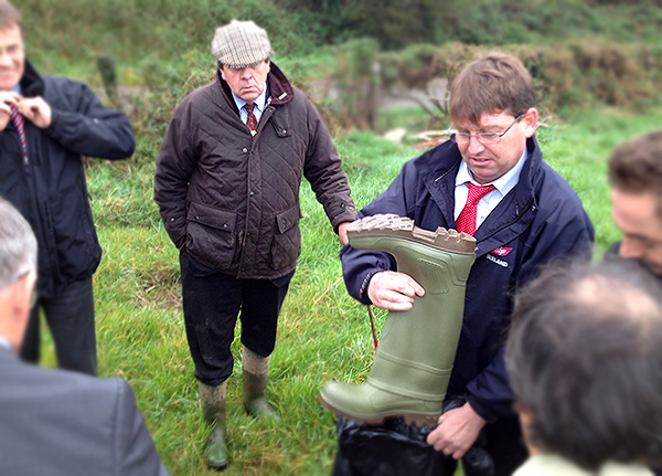 Die Gummistiefel borgen wir uns vom Farmer (der mit dem Houndstooth Cap). An die Krawatte für den Gang auf die Weide hätten wir selbst denken müssen.