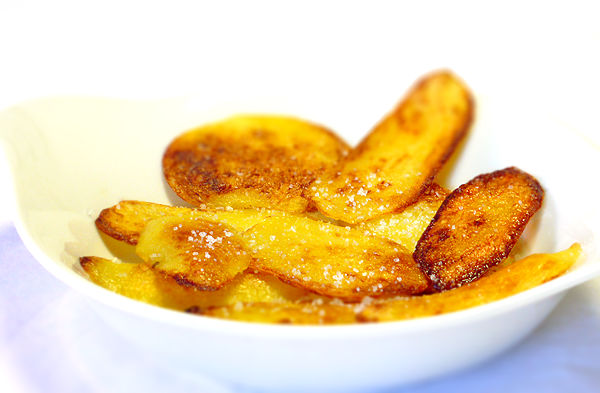 Die Kartoffeln ganz langsam – geht schon eine Stunde oder mehr – in einer Eisenpfanne (zur Not halt eine beschichtete) mit wenig Öl braten. Ab der Hälfte der Bratzeit gesalzene Butter dazugeben.