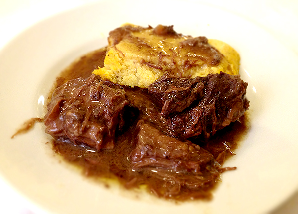Ortsübliches Mittagessen in Brescia: Geschmorter Esel mit Polenta.