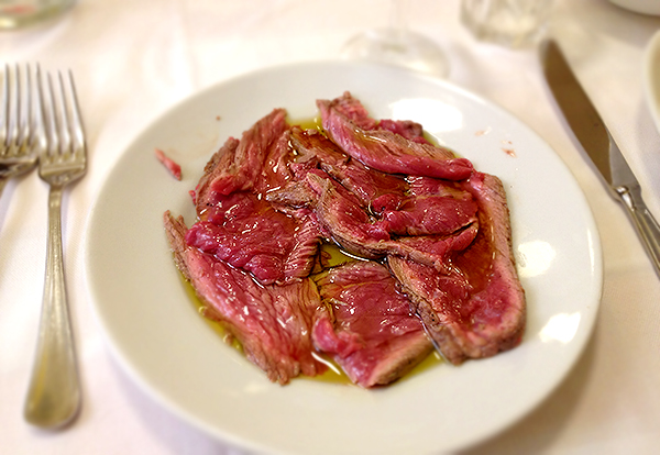 Also erstens: Die Temperatur! Das hauchdünn aufgeschnittene Fleisch war zimmerwarm. Das Fett einladend glänzend, beinahe am schmelzen. Und das Aroma, um Welten intensiver, als wenn dir ein Wirt die kalte Platte direkt aus dem Kühlschrank serviert, als wolle er sich für irgendetwas an dir rächen.